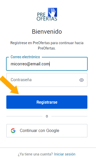 Coloca tu correo electrónico y elegí una contraseña (recordá anotarla en un lugar seguro para no olvidarte). Luego presiona el botón «Registrarse»